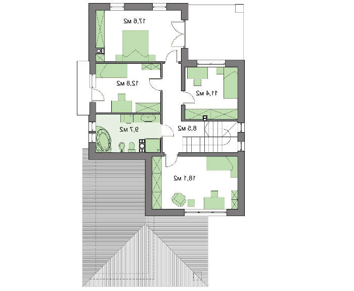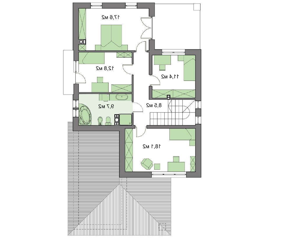 Жилой дом включает 5 спален, для удобства они разнесены на разные этажи. Комната первого уровня отдалена от шумных мест, близкое размещение санузла и гардероба очень удобно. Второй этаж — это четыре спальни разной площади. Две комнаты имеют выходы на балконы, это удобно и практично.