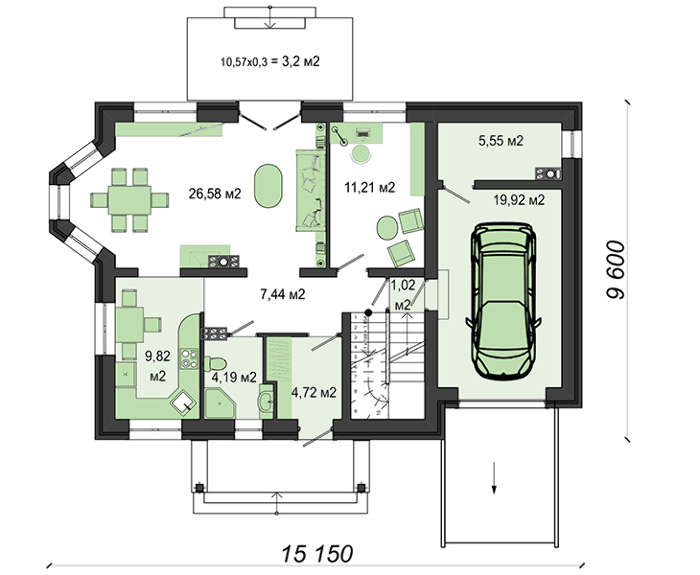Большую часть площади первого этажа занимает гостиная, для увеличения пространства она соединена со столовой. Эркер, как самая роскошная часть комнаты, отводится под обеденный стол, за счет чего прием пищи будет проходить среди природной красоты. Встроенный гараж надежно укроет от атмосферных осадков автомобиль. Для выполнения сервиса, хранения инструмента и запчастей имеется просторная мастерская.