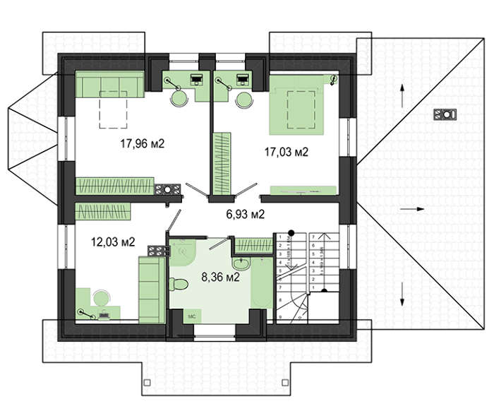 Помещений для сна четыре. Комната отдыха, находящаяся на первом этаже, имеет меньшие размеры, чем спальни второго уровня. Они все просторные, но между собой отличаются по площади. К услугам жильцов большой санузел, где достаточно места для размещения всего необходимого сантехнического оборудования.