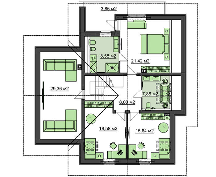При относительно небольших размерах дом максимально функционален. Первый этаж включает помещения дневного времяпрепровождения, а на втором господствуют спальни.