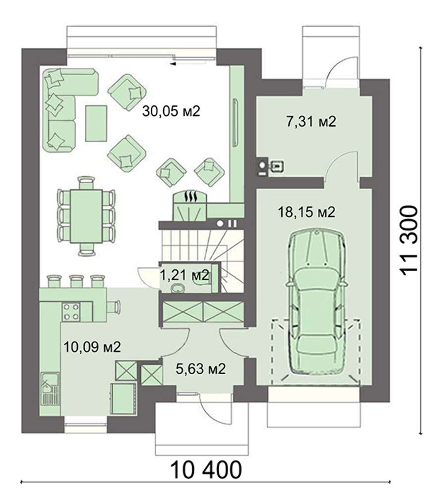 При проектировании внутреннего пространства дневная и ночная зоны четко разнесены на разные этажи. Первый уровень включает гостиную и гараж. Место для хранения автомобиля рассчитано на одно транспортное средство, примыкающее помещение удобно оборудовать под мастерскую. В уютной атмосфере быстрее выполняются сервисные работы.
