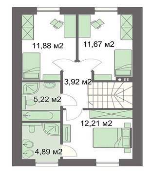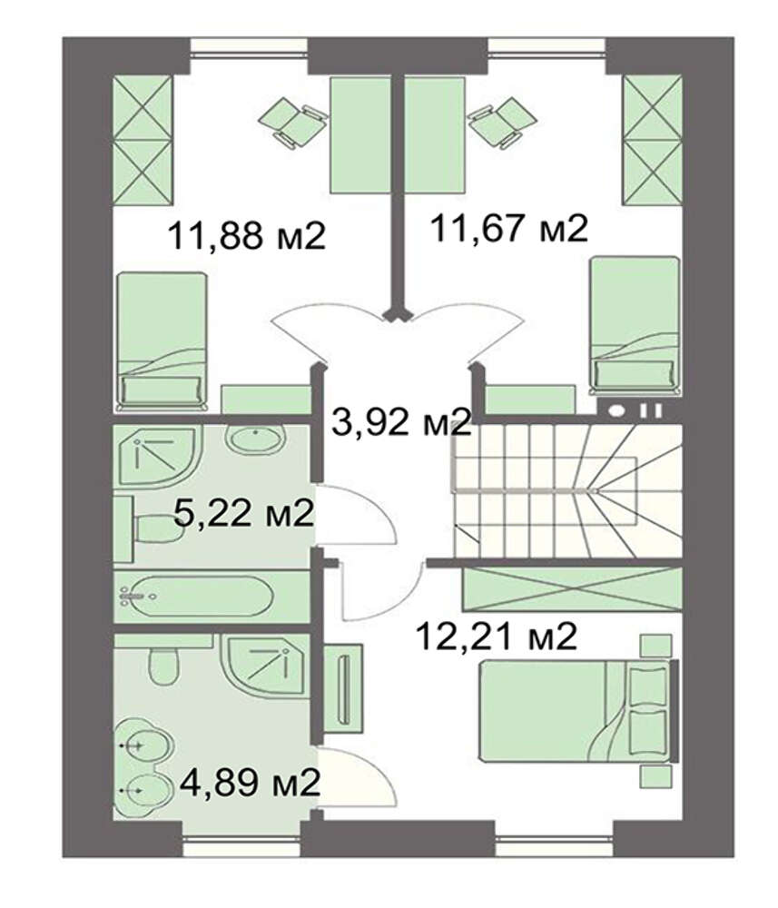 Спальных помещений три, их изолированность на просторе второго этажа гарантирует спокойный и тихий отдых. Особым комфортом наделены апартаменты хозяина. Собственный санитарный узел позволяет наслаждаться водными процедурами вне зависимости от иных членов семьи.