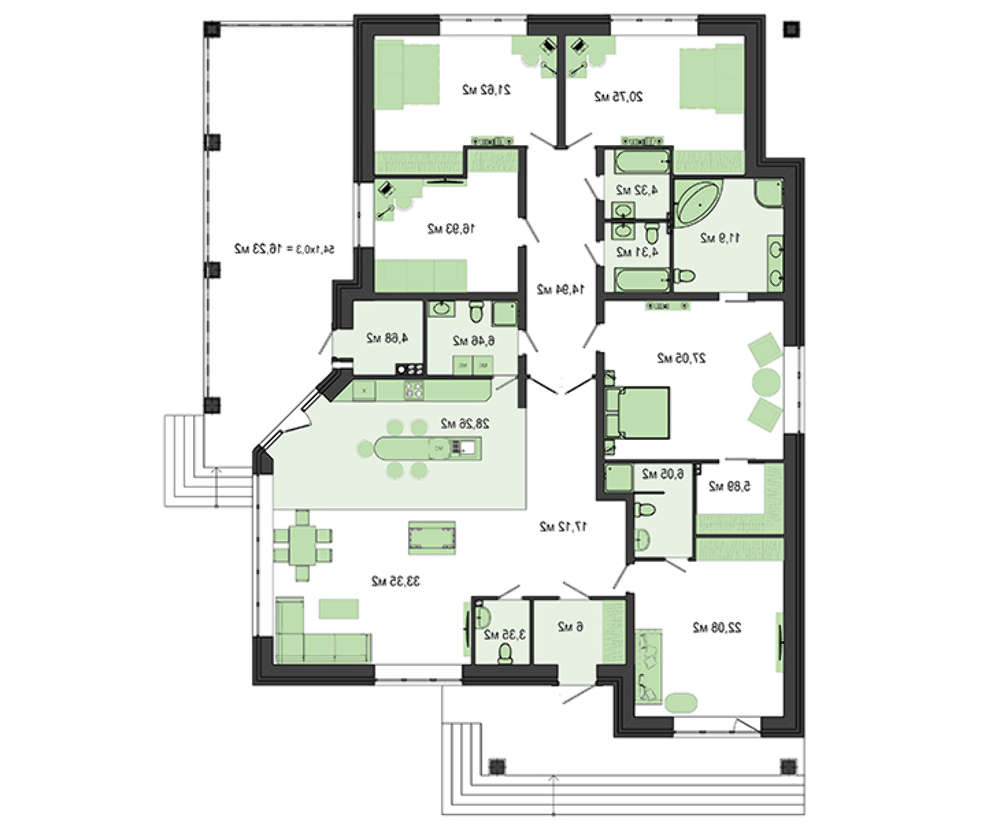 Расположение помещений в один уровень не помешало проектировщикам найти место для пяти спален. Они отличаются формами, размерами и планировкой, хозяин дома получает возможность выбрать наиболее благоустроенное. Эта спальня отличается личным гардеробом и санузлом. В связи с тем, что в плане имеется 6 санитарных помещений, практически у каждой спальни есть своя ванно-банная комната.