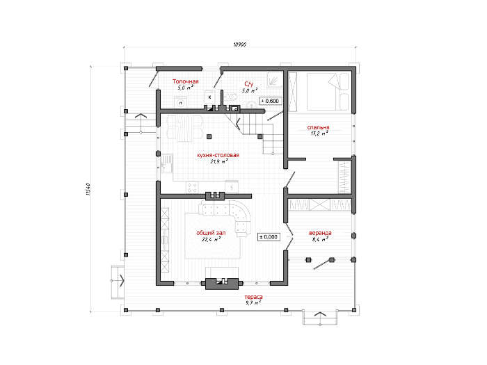 Проект содержит три раздела – Архитектурный, Конструктивный и Инженерный: водоснабжение, отопление, вентиляция, канализация, электроснабжение (приобретается за дополнительную плату) + Пояснительная записка.