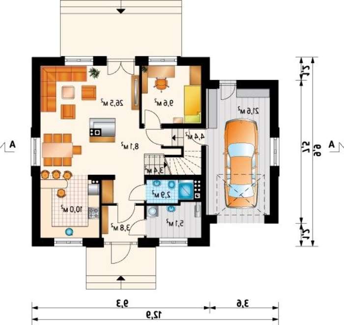На первом этаже находиться помещение 9,6 кв. м. Его используют в качестве спальни для членов семьи преклонного возраста. Если представителей старшего поколения нет, в ней организовывают комнату отдыха для гостей.