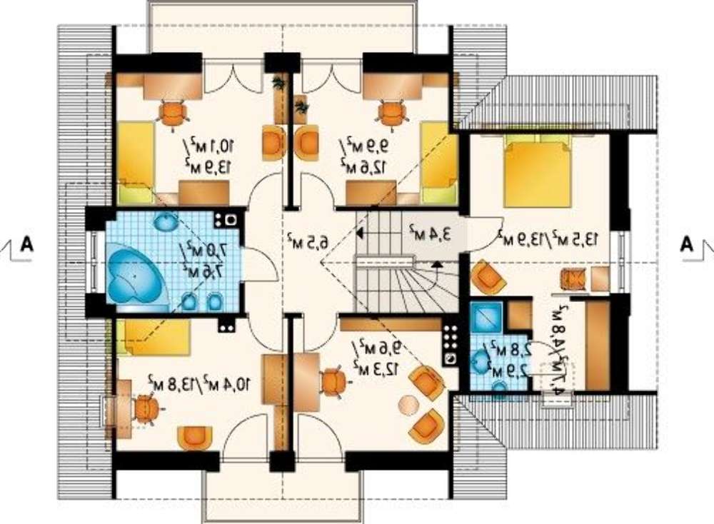 Мансардный этаж представлен как личное пространство членов семьи. При распределении комнат проблем не будет, все три детских спальни примерно одинаковой площади. На этаже находится совмещенное санитарное помещение общего пользования. Личная территория владельца представлена кабинетом и апартаментами с собственным санузлом и гардеробом.