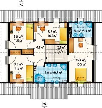 Верхний уровень представляет собой территорию сна. Она включает три спальни, небольшой коридор, общую ванную комнату и апартаменты хозяина с собственным санузлом.