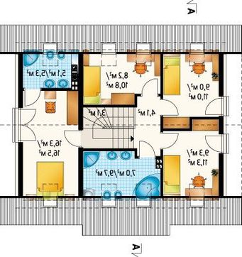 Верхний уровень представляет собой территорию сна. Она включает три спальни, небольшой коридор, общую ванную комнату и апартаменты хозяина с собственным санузлом.