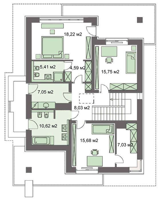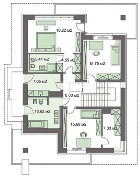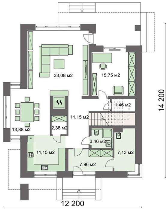 Особенностью жилого дома стали максимально комфортабельные личные помещения и шикарная зона отдыха первого этажа. Гостиная соединена со столовой, ее центральную самую красивую часть занимает камин. Для обеденного стола чаще всего выбирают эркер, в этом случае прием пищи происходит в уникальной природной обстановке, что способствует хорошему настроению и отличному пищеварению. Отдельное помещение на усмотрение хозяев может быть использовано под бизнес-кабинет или детскую, такие комнаты хорошо подходят под личные апартаменты старших членов семьи.