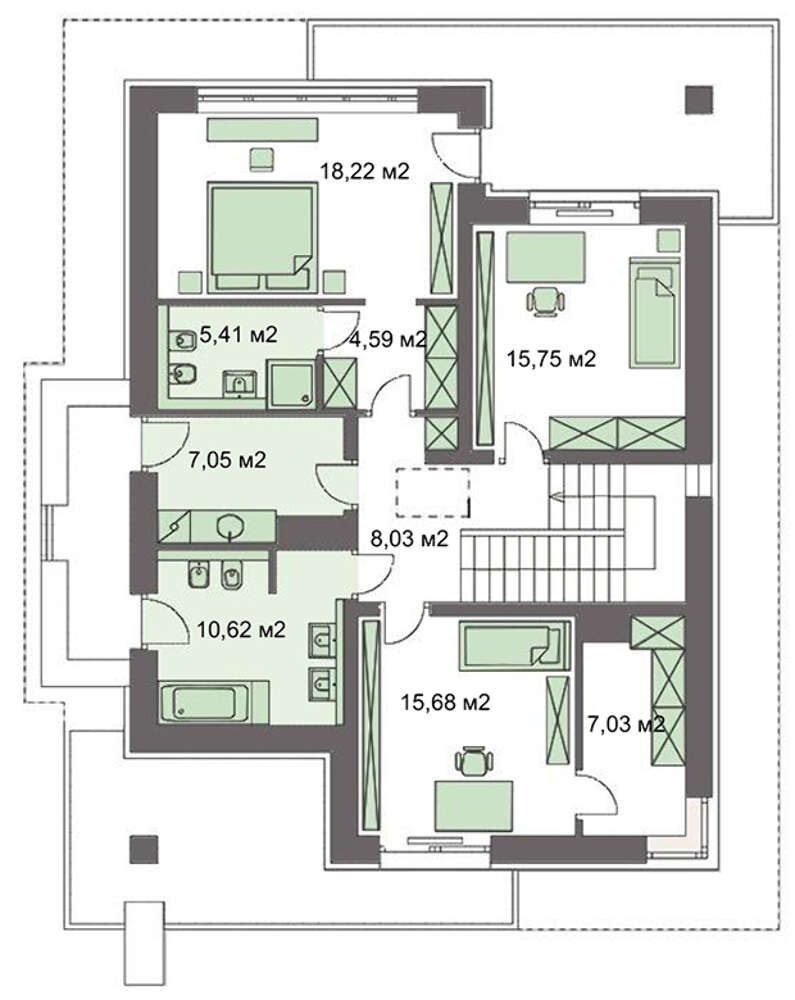Три спальни размещены на втором этаже. Апартаменты отличаются габаритами, планировкой и наличием вспомогательных помещений. Особенность второго этажа в просторной террасе, площадь которой позволяет хозяевам проводить здесь много времени, отдыхать на свежем воздухе и устраивать романтические встречи.