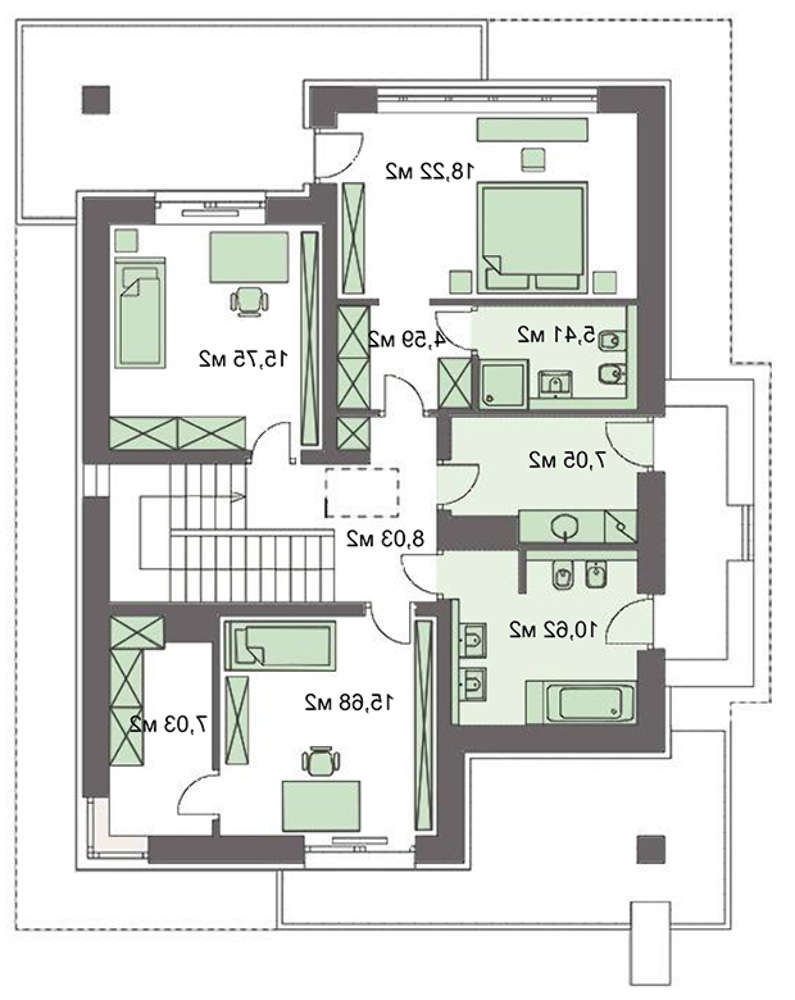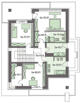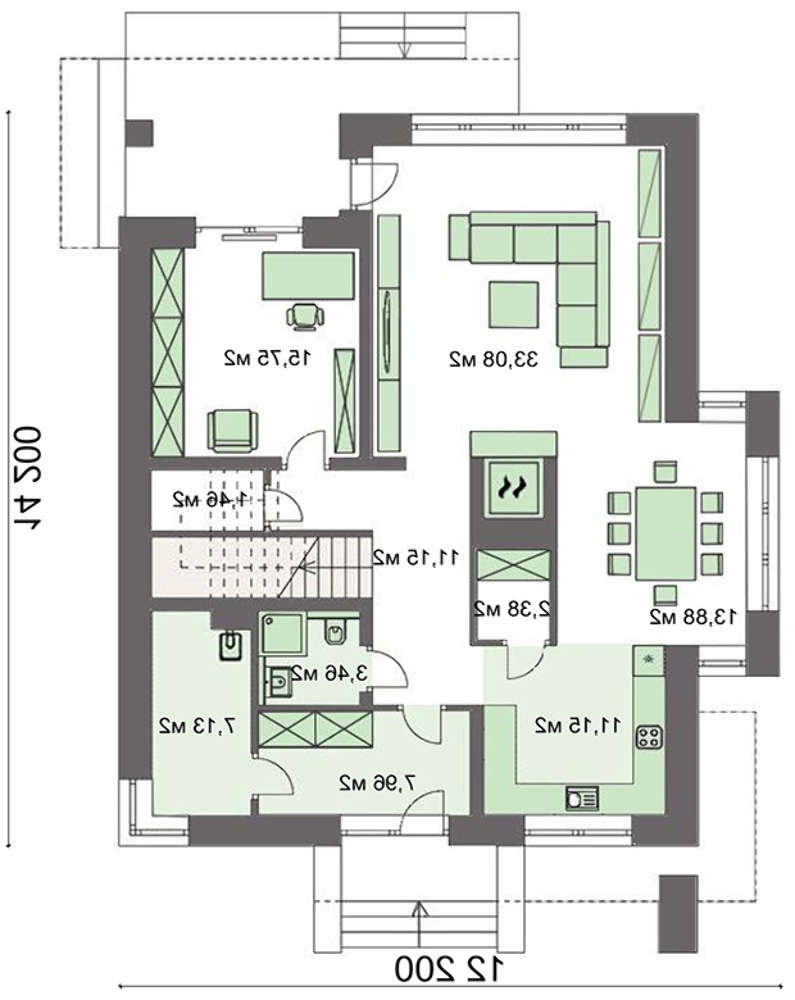 Особенностью жилого дома стали максимально комфортабельные личные помещения и шикарная зона отдыха первого этажа. Гостиная соединена со столовой, ее центральную самую красивую часть занимает камин. Для обеденного стола чаще всего выбирают эркер, в этом случае прием пищи происходит в уникальной природной обстановке, что способствует хорошему настроению и отличному пищеварению. Отдельное помещение на усмотрение хозяев может быть использовано под бизнес-кабинет или детскую, такие комнаты хорошо подходят под личные апартаменты старших членов семьи.