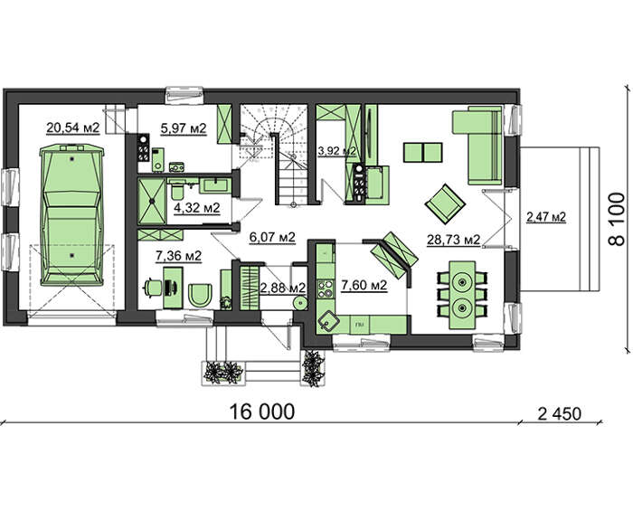Проект содержит три раздела – АрхитектурныйКонструктивный и Инженерный: водоснабжение, отопление, вентиляция, канализация, электроснабжение (приобретается за дополнительную плату) + Пояснительная записка.