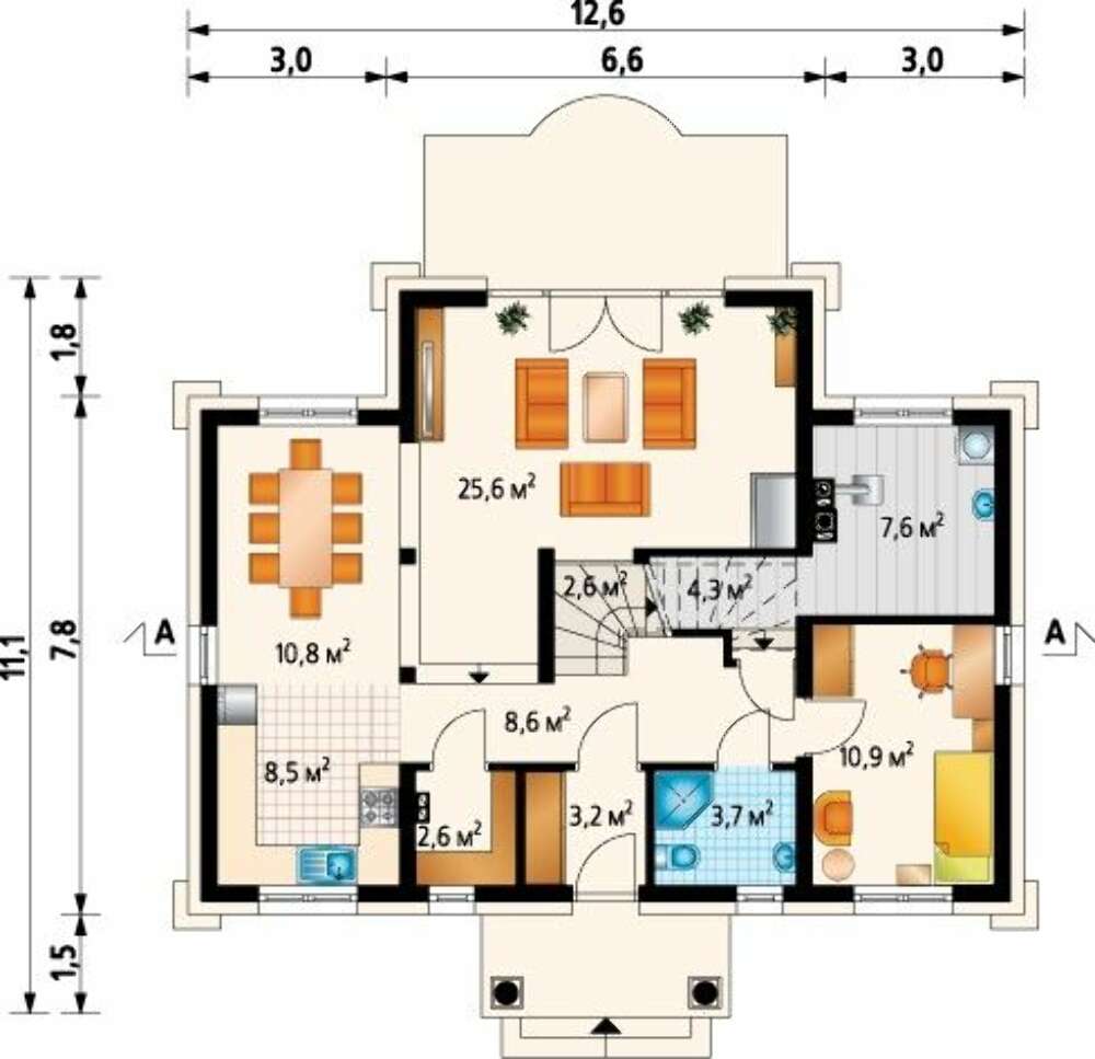 Планировку первого этажа нельзя назвать заурядною. Прямо в центре строения стоит лестница, соединяющая дом в одно целое. Вокруг нее хороводом закружились комнаты и подсобные помещения. Отдельно, чтобы не мешал шум общих комнат, стоит спальня. Поселив здесь старшее поколение или определив помещение под кабинет можно не волноваться — покой никто не потревожит.