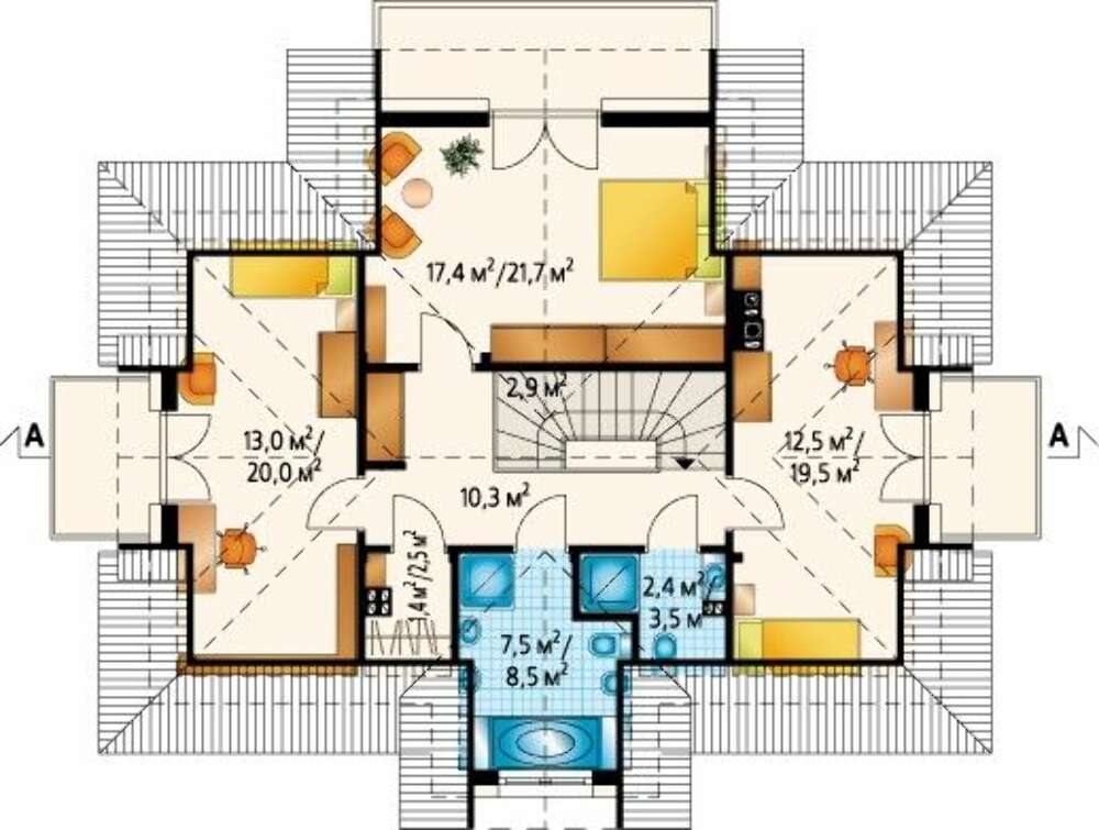 Второй этаж повторяет первый. Хоровод комнат вокруг лестницы на ночь превращается в спальни. Их здесь три. Каждая — большая и красивая, со своим выходом на балкон. Причем балкон-то индивидуальный, на разные части света. Значит, гарантирована романтика и никто не потревожит покой.