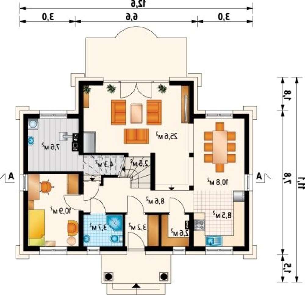 Планировку первого этажа нельзя назвать заурядною. Прямо в центре строения стоит лестница, соединяющая дом в одно целое. Вокруг нее хороводом закружились комнаты и подсобные помещения. Отдельно, чтобы не мешал шум общих комнат, стоит спальня. Поселив здесь старшее поколение или определив помещение под кабинет можно не волноваться — покой никто не потревожит.