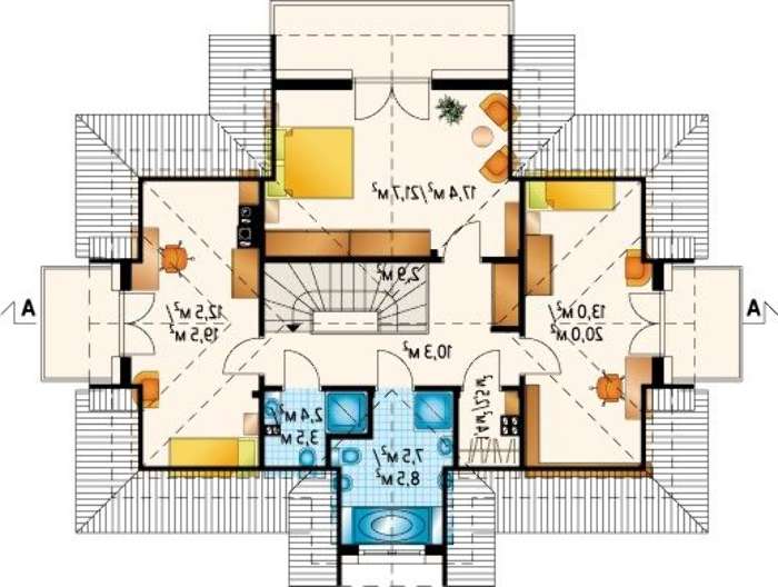 Второй этаж повторяет первый. Хоровод комнат вокруг лестницы на ночь превращается в спальни. Их здесь три. Каждая — большая и красивая, со своим выходом на балкон. Причем балкон-то индивидуальный, на разные части света. Значит, гарантирована романтика и никто не потревожит покой.