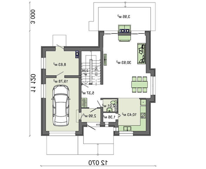 Пространство коттеджа разделено на дневную и ночную зоны. Почти в двадцать квадратов гараж рассчитан на содержание одного автомобиля. Размещенную рядом топочную используют для хранения слесарного инструмента и выполнения работ по обслуживанию транспорта.