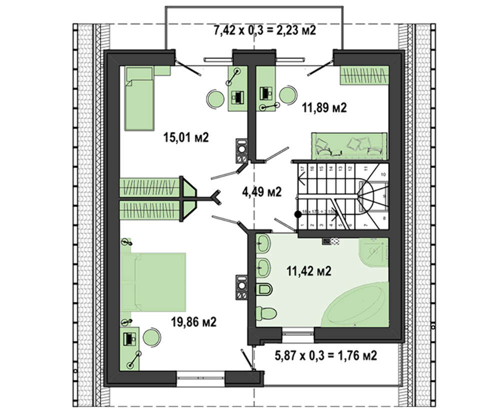 Проект содержит три раздела – АрхитектурныйКонструктивный и Инженерный: водоснабжение, отопление, вентиляция, канализация, электроснабжение (приобретается за дополнительную плату) + Пояснительная записка.