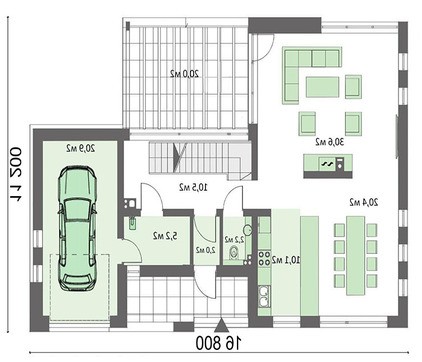 Дневная зона представлена гостиной. Благодаря отсутствию разделяющих перегородок, получен простор. Центральная часть отдана под камин, который не только согревает площадь, но и как символ домашнего очага, создает теплую дружественную атмосферу. В проекте предусмотрен гараж для размещения одного автомобиля и небольшая мастерская под сервисные работы.