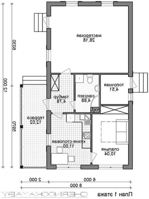В смежном помещении находится спальня, где уставший хозяин может отдохнуть, а при необходимости и заночевать. Остальную площадь дома занимает тамбур, играющий роль прихожей, санузел, где хозяин после трудового дня может привести себя в порядок и котельная, обеспечивающая отопление дома в холодное время года.