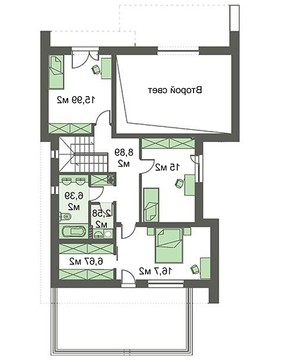 Все спальни второго этажа имеют достаточные для комнат отдыха размеры, от 15 квадратов. Личные балконы станут дополнительным преимуществом. Общая для уровня санитарная зона удобна поделена на два помещения.