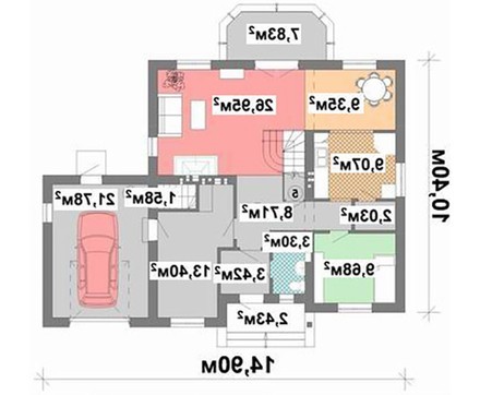 Первый этаж включает множество помещений самого разного назначения. Встроенный гараж позволяет с комфортом разместить одну машину. Прилегающую площадь можно использовать как мастерскую или кабинет. Зона отдыха включает гостиную и столовую. Г-образная форма визуально отделяет пространства друг от друга и позволяет непотревоженно отдыхать в уютной обстановке у камина. Продолжением жилого пространства станет небольшая терраса, здесь можно организовать чаепитие или вести дружескую беседу.
