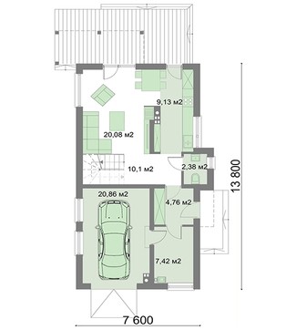 По плану гараж занимает площадь в 20 квадратов, его размеров достаточно для содержания одного авто. Комнату топочной можно использовать для хранения инструмента.