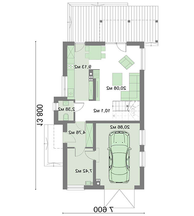 По плану гараж занимает площадь в 20 квадратов, его размеров достаточно для содержания одного авто. Комнату топочной можно использовать для хранения инструмента.
