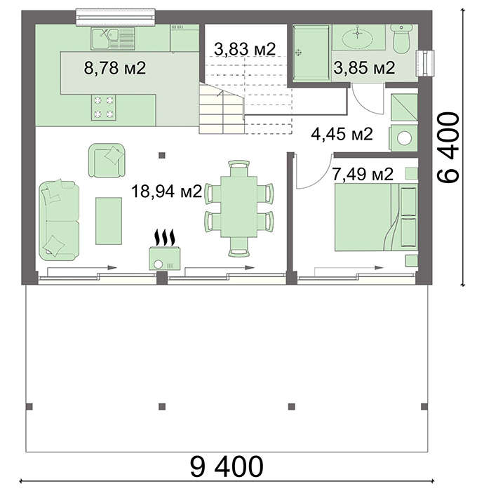 Просторное помещение для приема пищи и отдыха соединяет гостиную, кухню и столовую. За счет отсутствия перегородок комната наполнилась простором и светом. Камин имеет двойное назначение. Как источник тепла, он нагревает помещение и объединяет жильцов подобно домашнему очагу. Дополнительно его можно использовать для приготовления пищи, для этого предусмотрен выход камина на веранду.