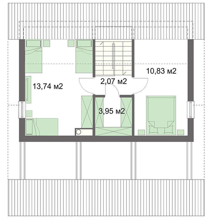 В проекте предусмотрено три помещения для отдыха. Спальня на первом этаже отлично подходит для проживания старшего поколения. Комнаты второго уровня отнесены в разные части, хозяева помещений не ограничивают приватную жизнь друг друга. Предусмотрена комната для гардероба, запасы одежды не будут загромождать дополнительную площадь.