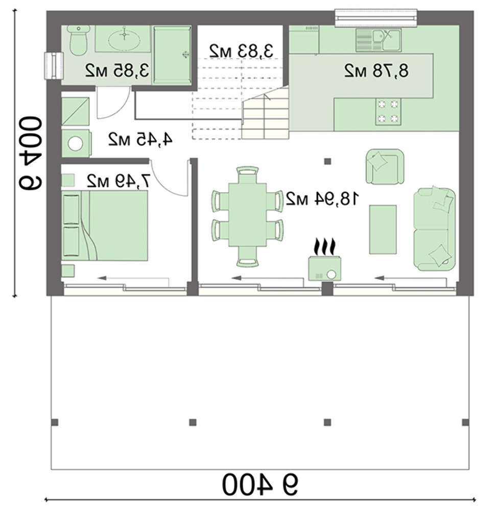 Просторное помещение для приема пищи и отдыха соединяет гостиную, кухню и столовую. За счет отсутствия перегородок комната наполнилась простором и светом. Камин имеет двойное назначение. Как источник тепла, он нагревает помещение и объединяет жильцов подобно домашнему очагу. Дополнительно его можно использовать для приготовления пищи, для этого предусмотрен выход камина на веранду.