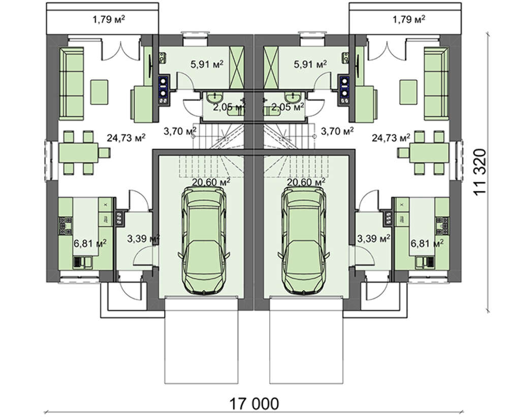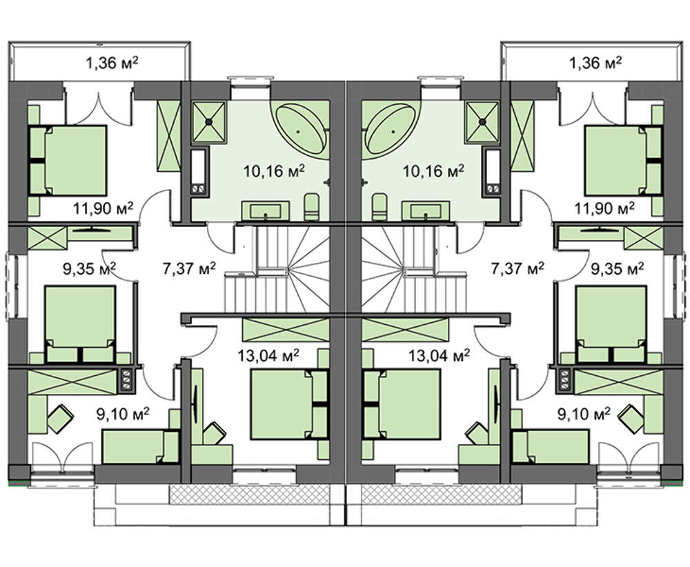Современный стильный таунхаус смотрится мощно и ярко. Использование в качестве покрытия нейтральных тонов получает одобрение владельцев. Дом рассчитан на проживание двух семей. Чаще на такой планировке останавливаются родственники или друзья, желающие квартировать рядом, но независимо. При этом налицо экономия на строительстве.
