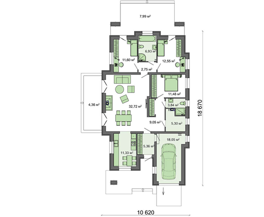Проект содержит три раздела – АрхитектурныйКонструктивный и Инженерный: водоснабжение, отопление, вентиляция, канализация, электроснабжение (приобретается за дополнительную плату) + Пояснительная записка.