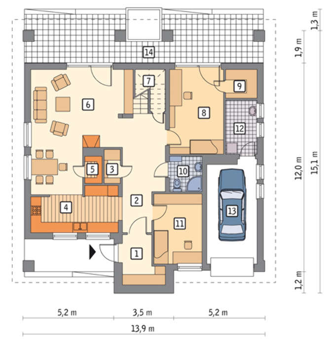 Проект содержит три раздела – АрхитектурныйКонструктивный и Инженерный: водоснабжение, отопление, вентиляция, канализация, электроснабжение (приобретается за дополнительную плату) + Пояснительная записка.