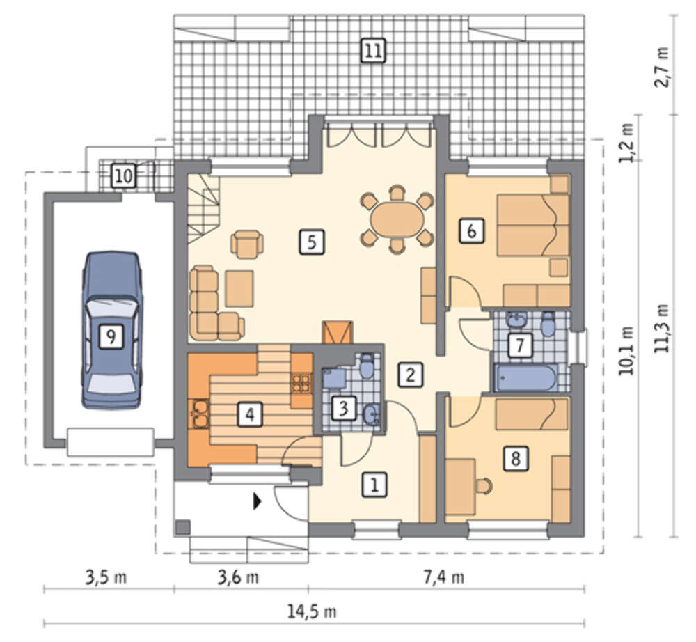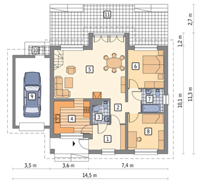 Проект содержит три раздела – АрхитектурныйКонструктивный и Инженерный: водоснабжение, отопление, вентиляция, канализация, электроснабжение (приобретается за дополнительную плату) + Пояснительная записка.