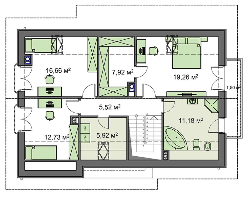 Второй этаж предназначен для ночного отдыха. Здесь расположены спальни членов семьи. Все помещения имеют выходы на балкон. Для поддержания комфортности запланированы санитарное, бытовое и гардеробное помещения, попасть в которые можно из общего холла.