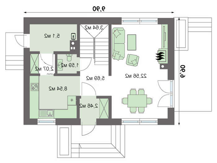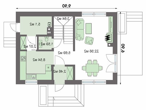 Пространство первого этажа разделено на две зоны. Гостиная соединена со столовой, Просторное помещение предназначено для праздничных обедов, а у открытого огня камина приятно погреться и отдохнуть. Предусмотрен отдельный выход на загородный простор, куда в хорошую погоду можно перенести молодежную вечеринку или утренник для детей.