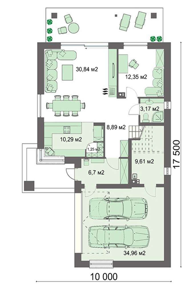 Зона отдыха объединяет кухню, столовую и гостиную. Совместное пространство помогает хозяйке при приготовлении кулинарных шедевров контролировать все происходящие в помещении события и за считаные минуты накрывать хлебосольные столы. Отсутствие перегородок расширяет пространство и наполняет его воздухом и простором. Полуоткрытая веранда за счет садовой мебели легко превращается место для дружеских встреч или проведение шашлычных церемоний.