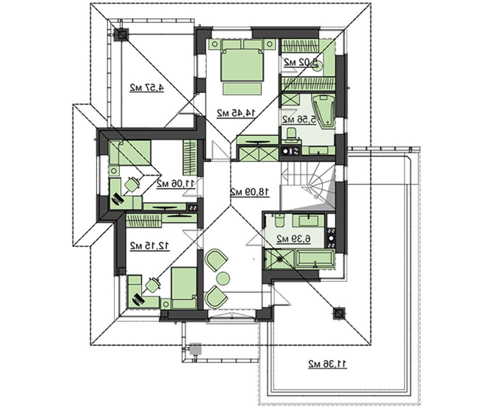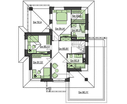 Три спальни второго этажа с комфортом разместят членов дружной семьи. Общий санузел и просторная терраса, откуда легко попасть из помещений, делают проживание особенно комфортным. Привилегия отдана помещению хозяина. Гардероб, санузел и собственная терраса будут особенно востребованы.